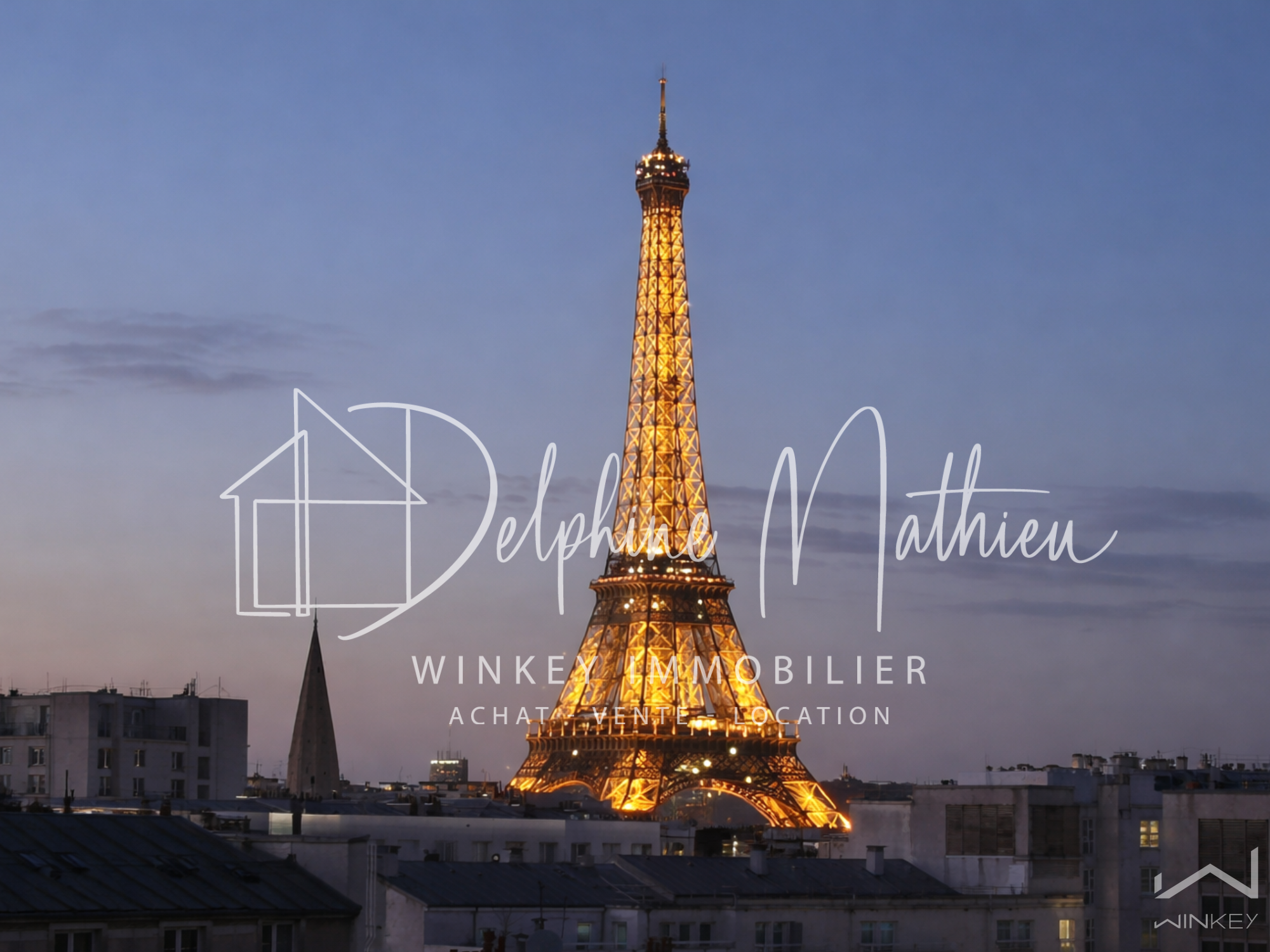 L’appartement s’ouvre sur une entrée desservant un séjour baigné de lumière grâce à son exposition plein sud, avec cuisine ouverte sublimée par une élégante arche. L’espace nuit comprend deux chambres, dont l’une bénéficie d’une vue imprenable sur la Tour Eiffel, un atout rare et particulièrement recherché. Un dressing, une salle de bains et des WC séparés complètent l’agencement.