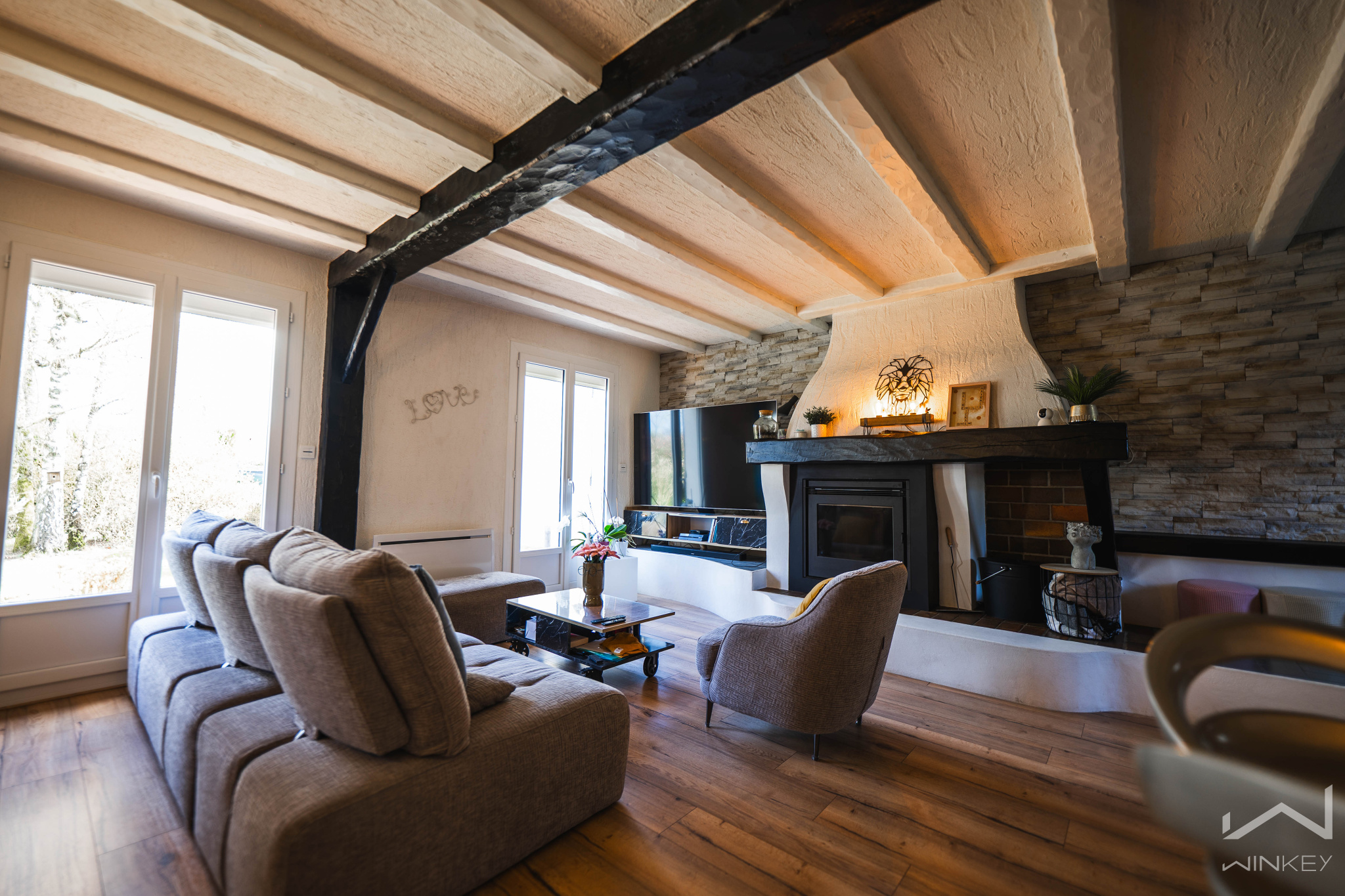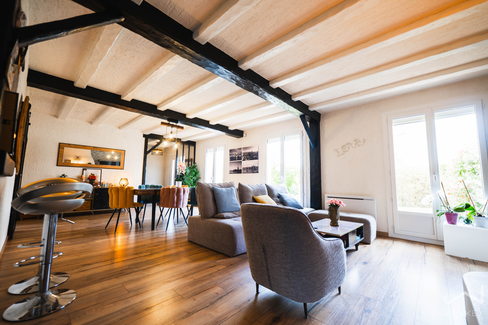 Le rez-de-chaussée offre également un vaste salon/salle à manger lumineux d’environ 45 m², idéal pour recevoir, ainsi qu’une cuisine indépendante entièrement équipée, complétée par un cellier et une buanderie.