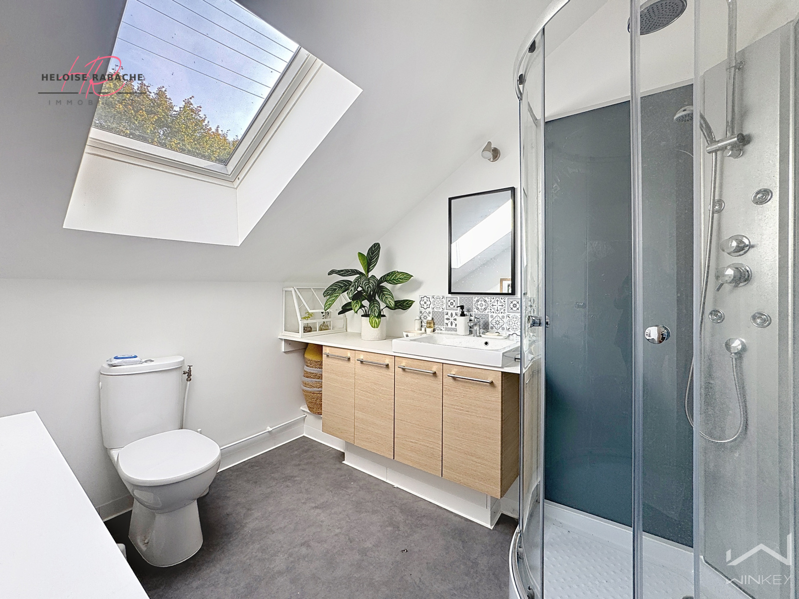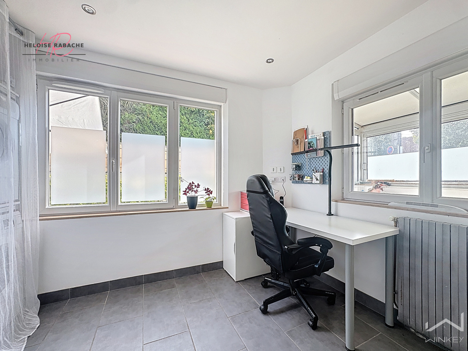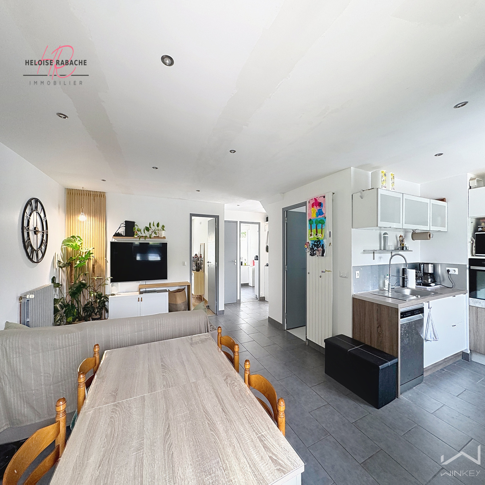Au rez-de-chaussée : une entrée ouverte sur la pièce de vie, un séjour lumineux avec cuisine ouverte aménagée et équipée, une chambre avec rangements, un bureau/buanderie, des WC et une salle de bains.