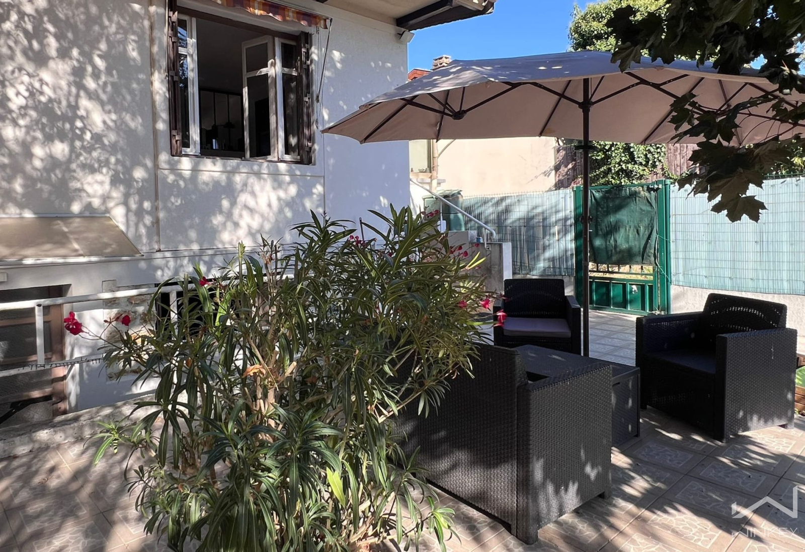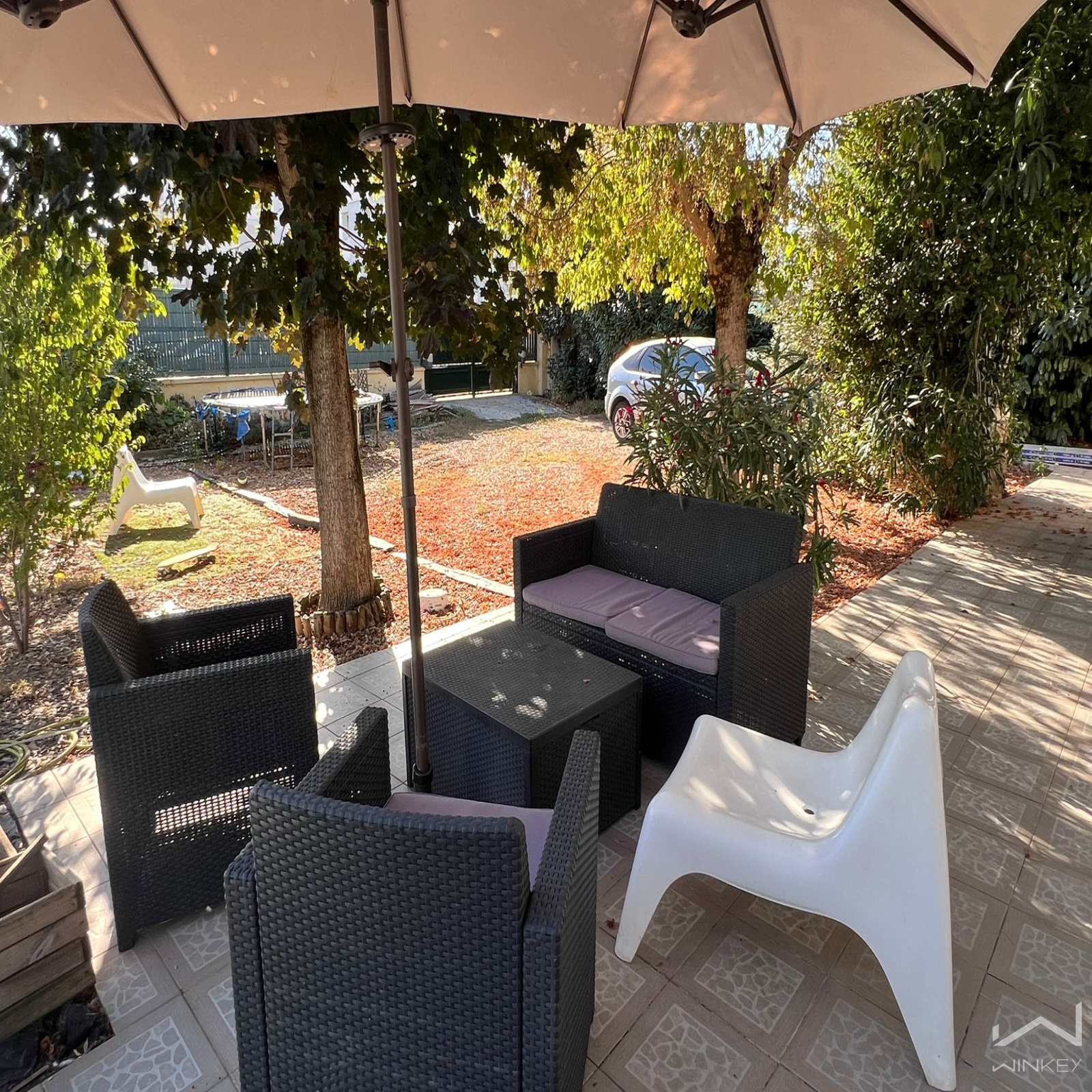 Le jardin sur le devant de la maison exposé Sud/Ouest permet de rentrer 3 voitures.