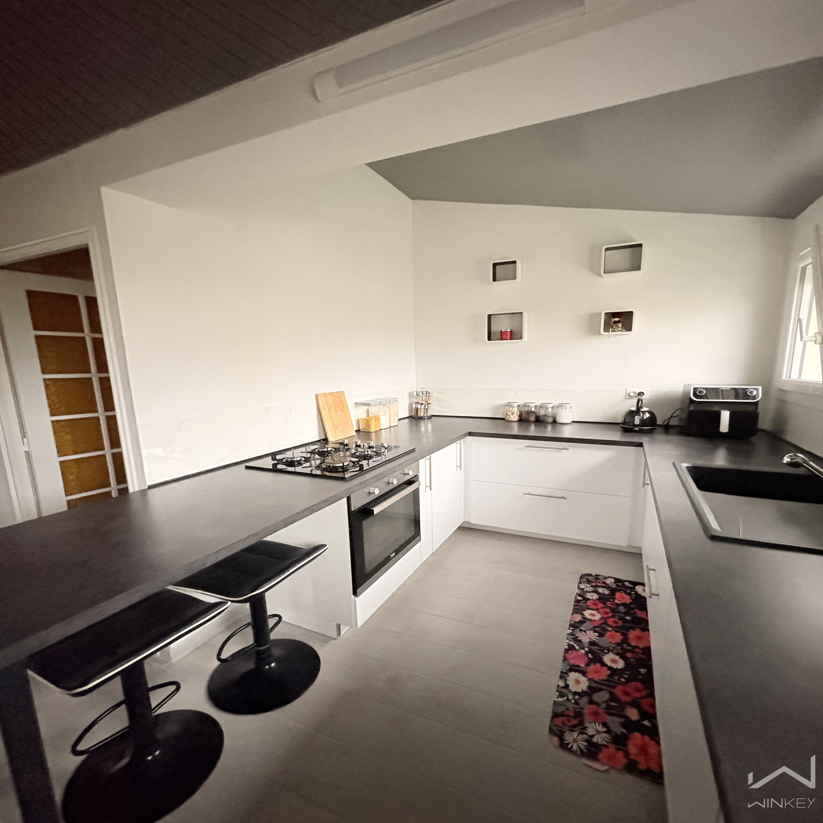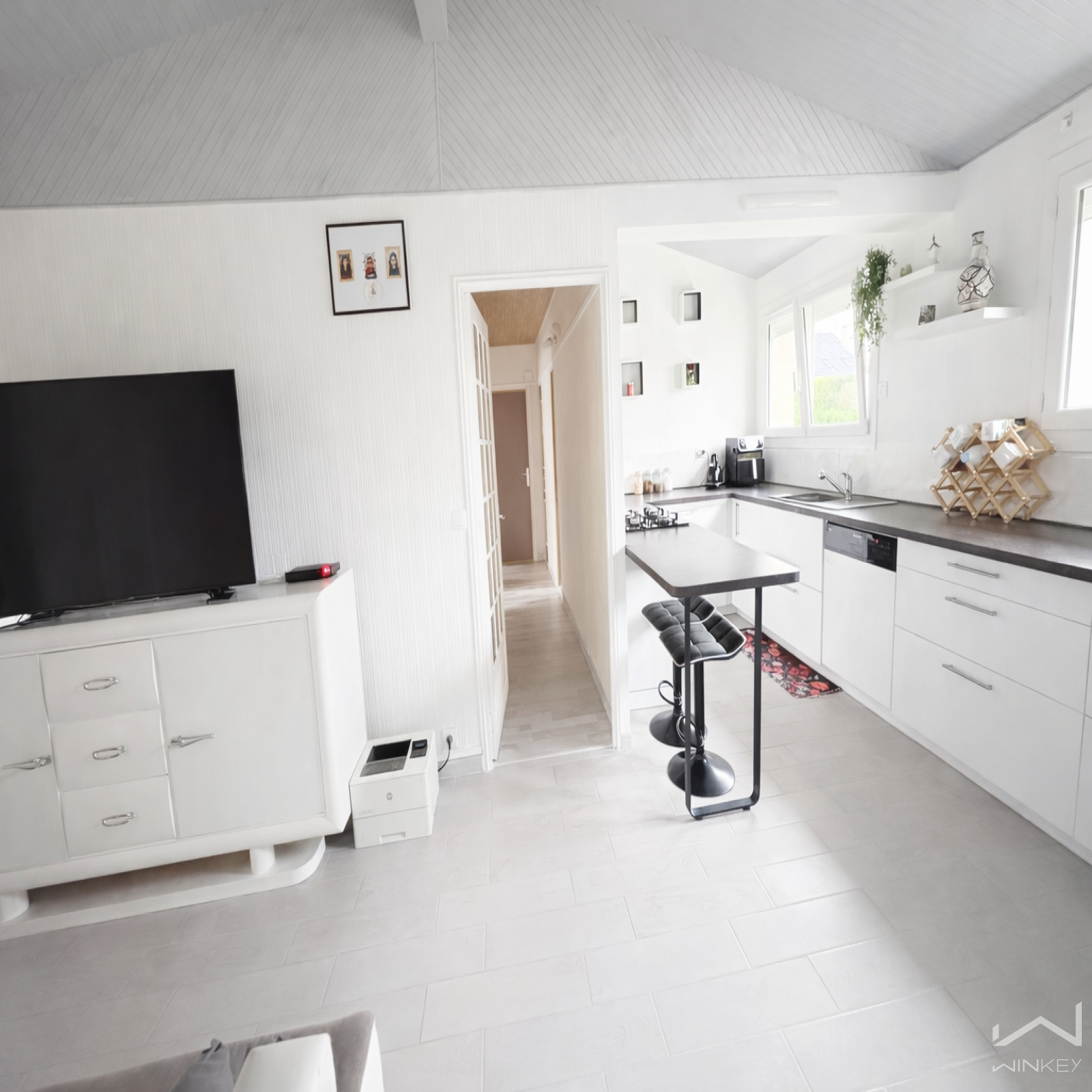 Dès l’entrée, vous accédez à un espace fonctionnel menant au sous-sol et à une pièce de vie baignée de lumière d’environ 30 m², sublimée par une cuisine contemporaine ouverte sur le séjour. Cet espace convivial s’ouvre sur une véranda, idéale pour profiter de la maison en toute saison.