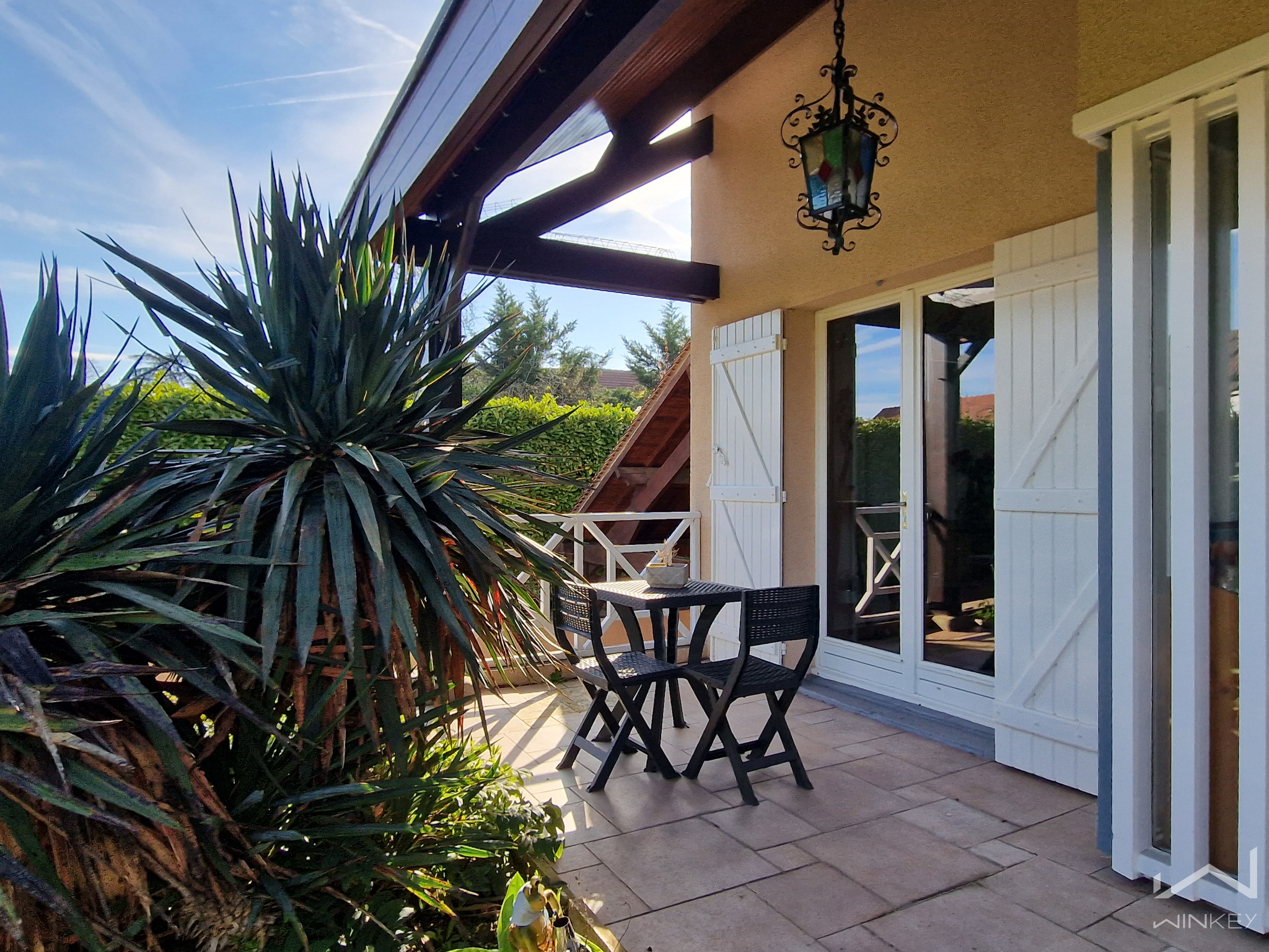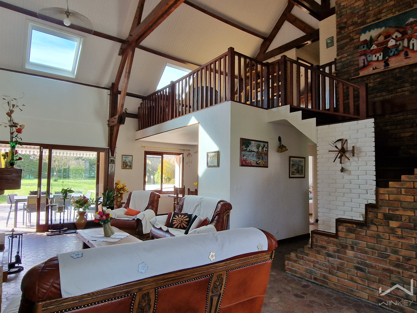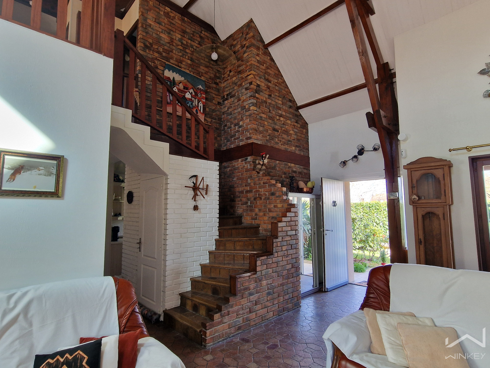 - Entrée sur séjour cathédrale avec cheminée insert. La baie vitrée s'ouvre sur une terrasse et le jardin plein SUD avec sa piscine DESJOYAUX