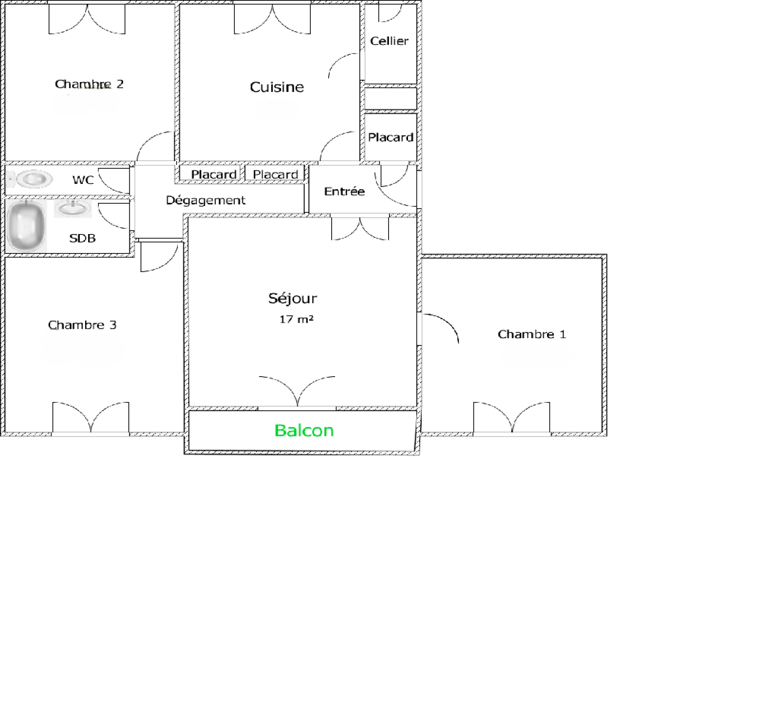 Il se compose d'une entrée avec placard, d'une cuisine avec cellier, d'un séjour avec balcon plein sud, d'un couloir avec 2 grands placards, 3 chambres, une salle de bains entièrement carrelée et un wc indépendant. Possibilité de condamner une chambre pour agrandir la pièce de vie.