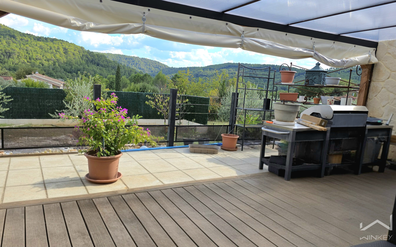 La maison dispose aussi d’une grande terrasse couverte parfaite pour profiter de l’extérieur en toute saison.