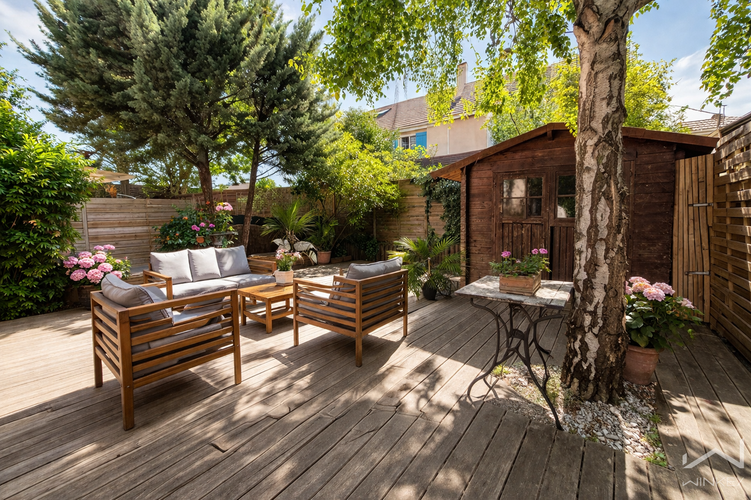 Diagnostics rassurants : installation électrique sans anomalie. La photo de la terrasse présente une proposition d'aménagement — la terrasse elle-même est conforme à la réalité.