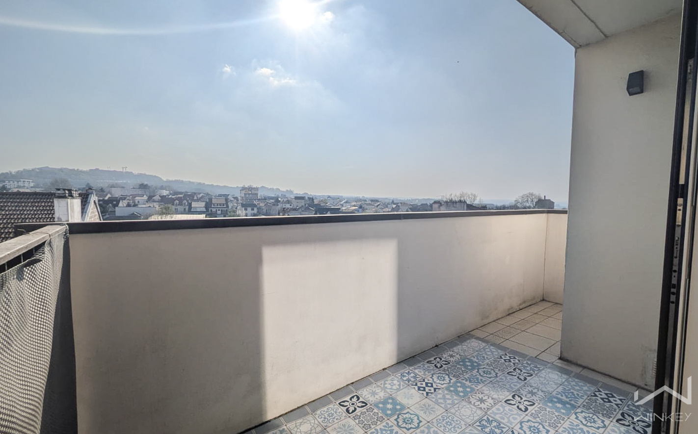 Traversant, au 6e et dernier étage avec ascenseur, sans vis-à-vis : le séjour de 23 m² s'ouvre sur un balcon plein sud-ouest avec vue sur le Mont-Valérien. La configuration est généreuse — trois chambres indépendantes dont une de 13 m², une cuisine séparée de 9,5 m², un cellier. Cave et parking en sous-sol inclus.