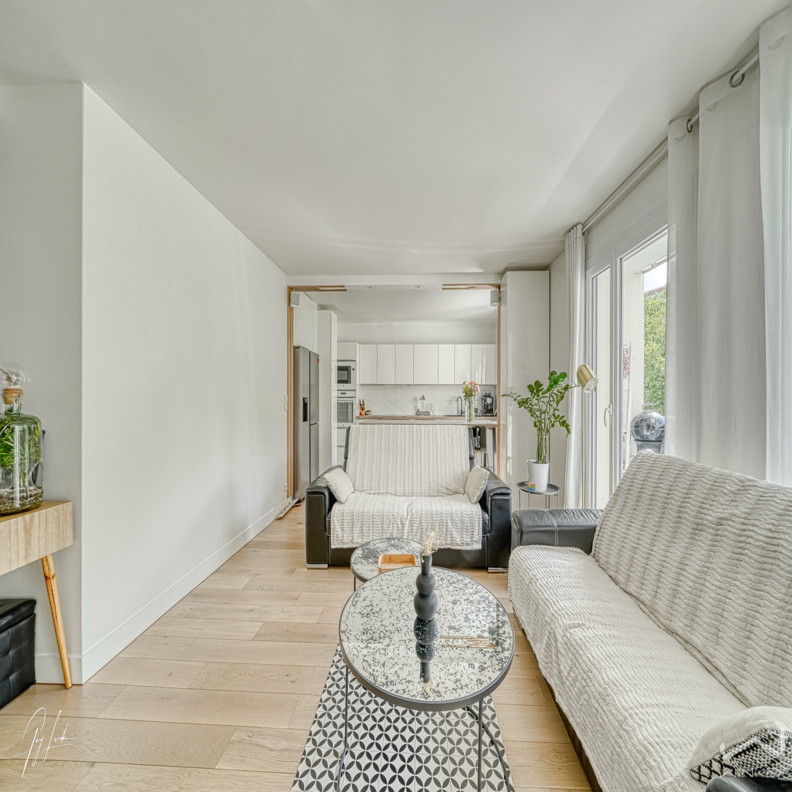 Vaste séjour de 38 m² exposé sud-est avec cuisine ouverte équipée, donnant sur un balcon agréable.