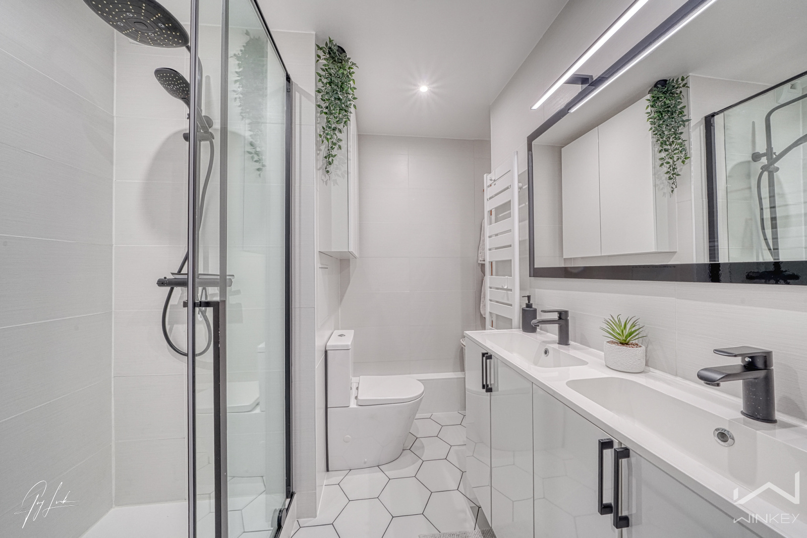 Une salle d’eau moderne avec douche à l’italienne et WC supplémentaire.