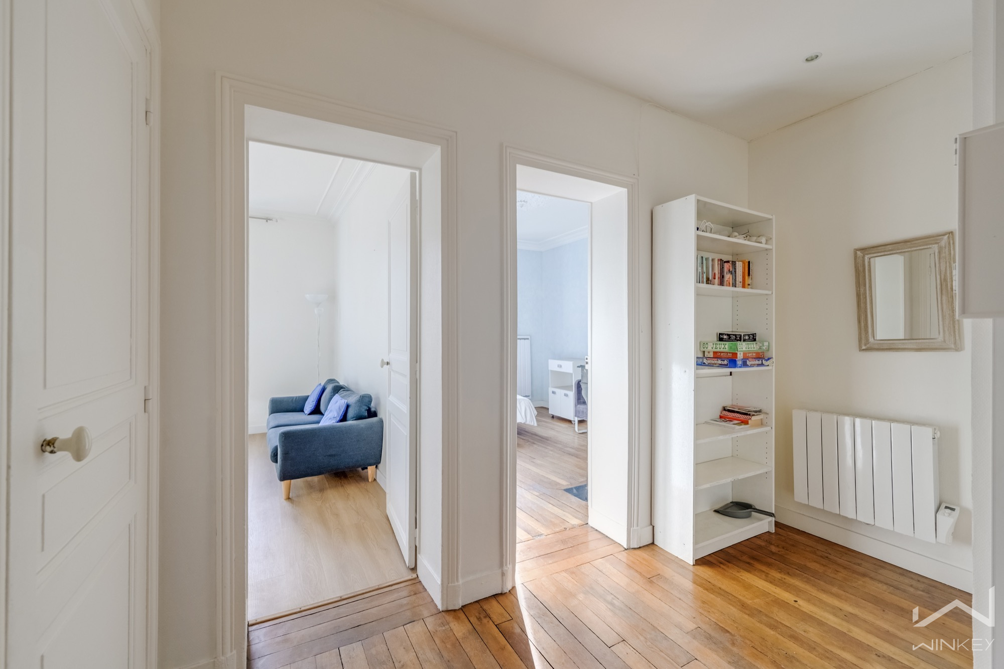 La grande entrée de l'appartement peut être intelligemment exploitée comme coin bureau, espace télétravail ou rangements, avec la possibilité d’optimiser la circulation intérieure par un léger ajustement de cloisonnement.