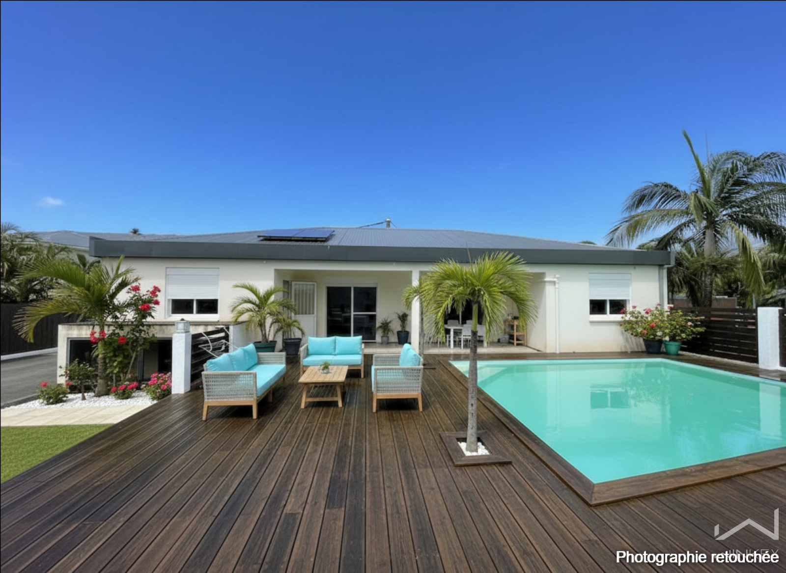 À l’extérieur, vous profiterez d’une piscine Desjoyaux au sel, d’une profondeur de 1,80 m, entourée d’un parquet en bambou, offrant un espace détente agréable et soigné.