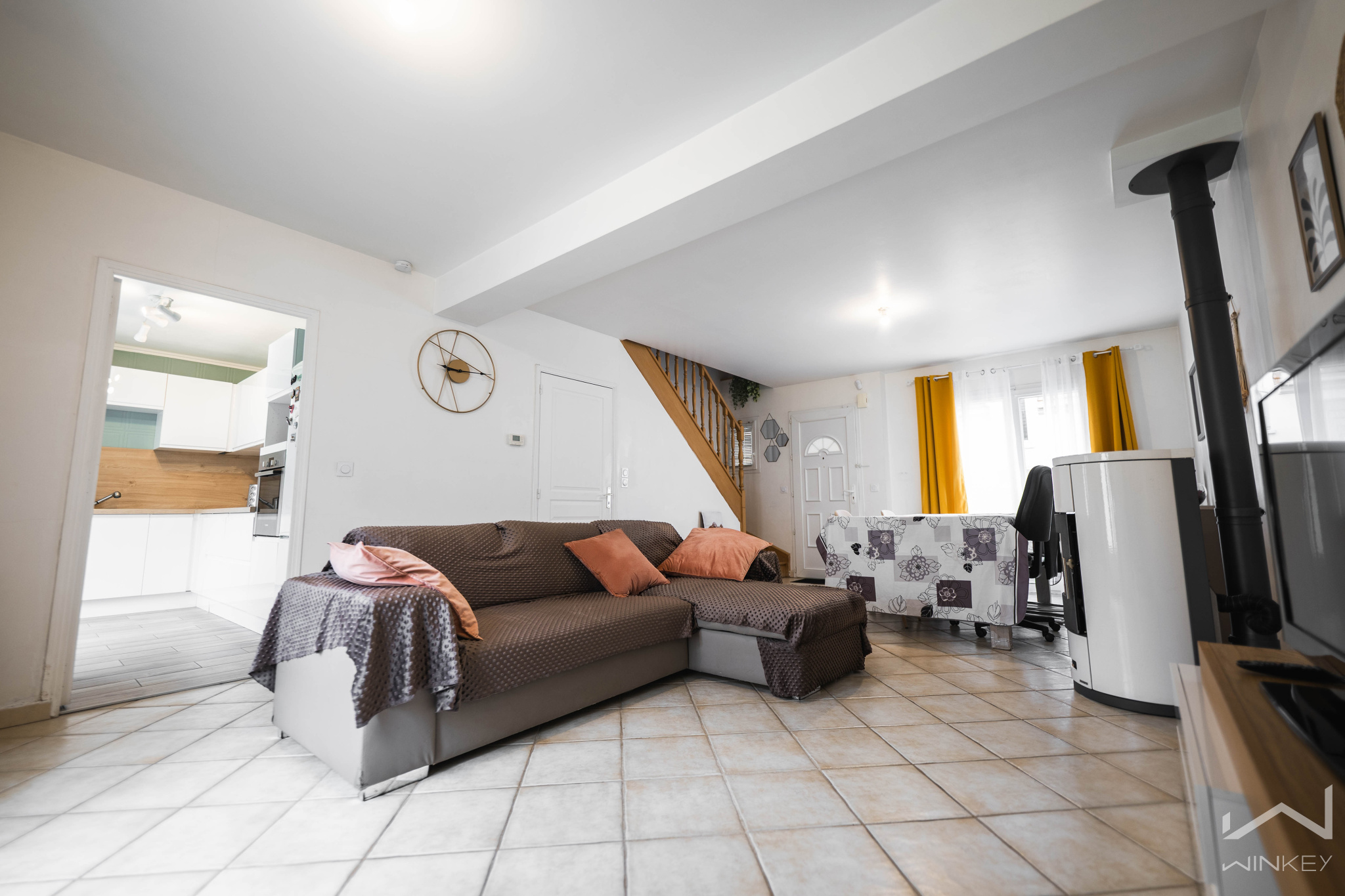 Au rez-de-chaussée, vous découvrirez un beau séjour lumineux équipé d’un poêle à bois, apportant charme et confort thermique. La cuisine équipée ouverte complète harmonieusement l’espace de vie. Un WC indépendant est également présent à ce niveau. L’accès direct à la terrasse permet de profiter pleinement des extérieurs.